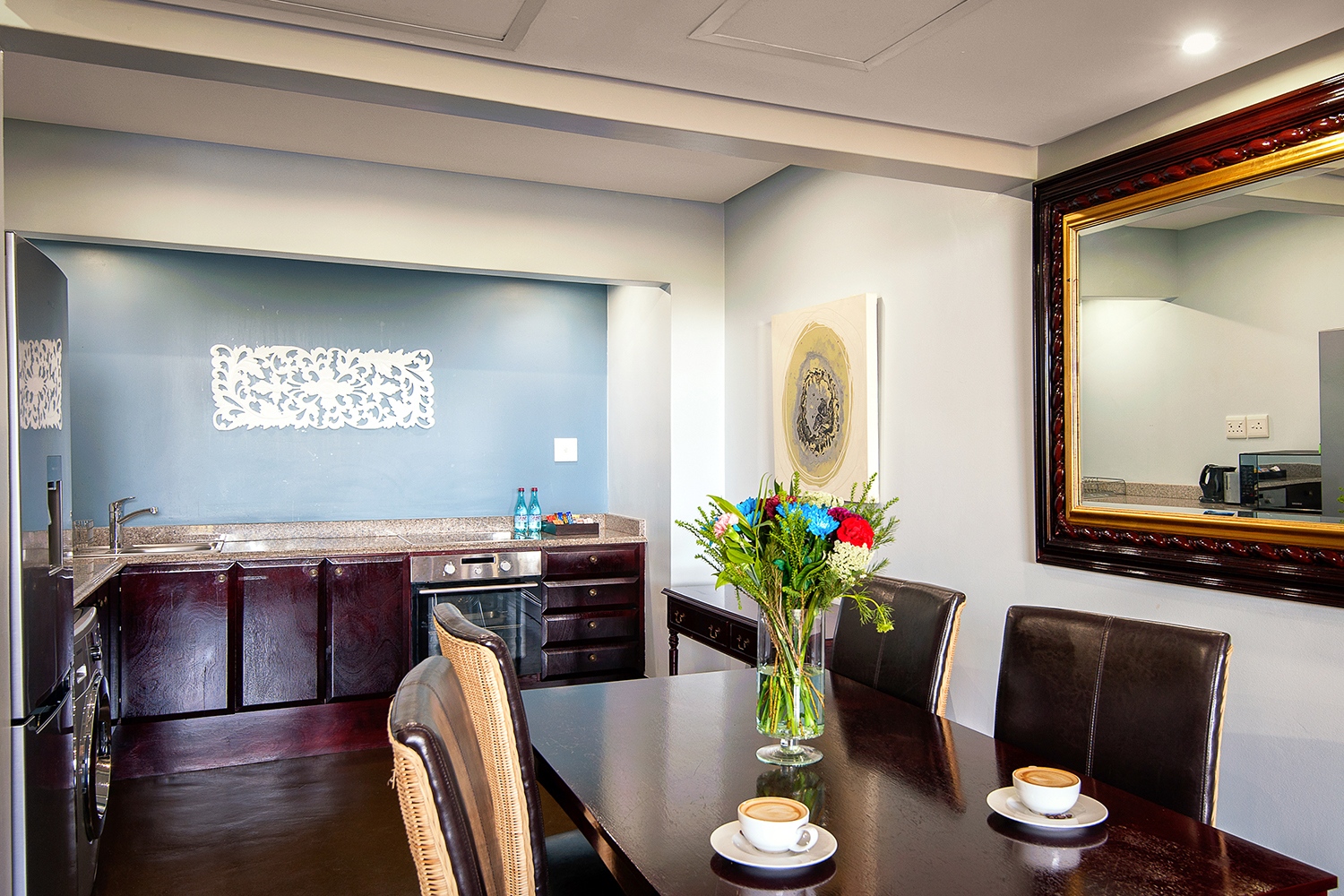 - Open plan lounge with kitchenette (fridge/freezer, microwave, dishwasher, stove with oven, washing machine)